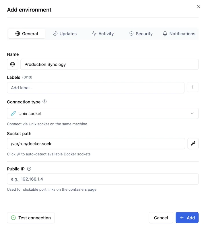 le bouton bleu + Add environment Dans mon cas, je l’ai nommé Production Synology, mais vous pouvez évidemment choisir le nom que vous souhaitez.