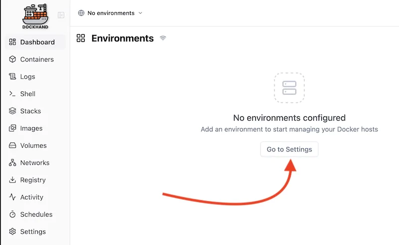 Lors de la première connexion, un message d’accueil s’affiche. Cliquez sur Got it. Dockhand vous demandera ensuite de créer un environnement…